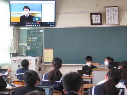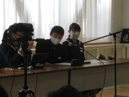 生徒は各自教室のタブレットで計画案と答弁書を見ながら話を聞きます。質問のある場合、自分の教室からタブレットパソコンを通して質問します。