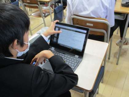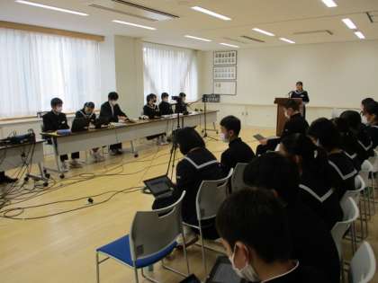 1、2限、速中生徒会の後期生徒総会が開かれました。会議室から各教室へのライブ配信の形で行います。活動計画書はタブレットパソコンにダウンロード済みです。はじめに生徒会長のあいさつがありました。