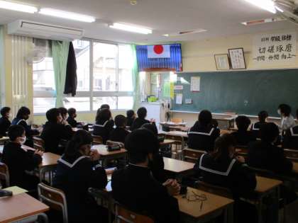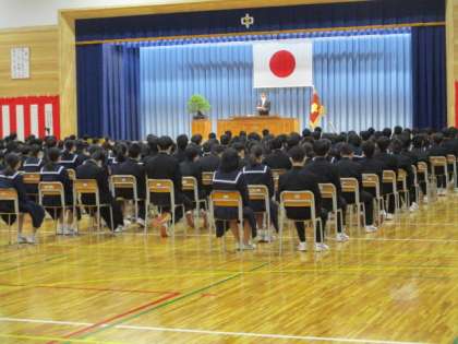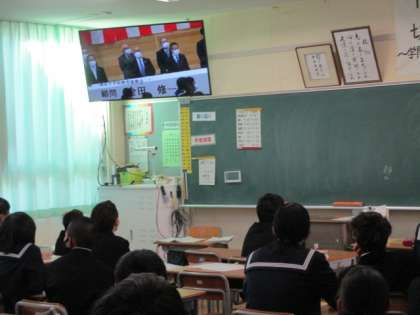 本日、教育振興会会長 柞山様をはじめ、多くの来賓のご臨席のもと、新体育館の竣工式を行いました。3年生は式場で参加し、1,2年生は教室で配信される映像をモニターを通して見ました。