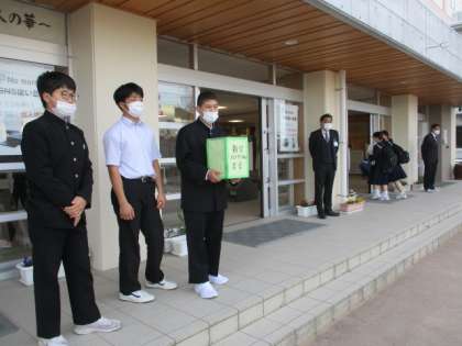 今日は晴れて気持ちのよい朝になりました。ボランティア委員会の生徒が新型コロナウイルス対策のための募金活動を行っています。今日の下校時間は16:30です。