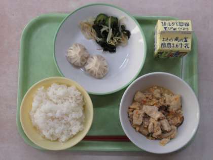 今日は、主菜にえびパオツがでました。皮がモチモチしていて中に入っているえびがプリッとした食感でおいしかったです。また、今日は副菜にきゅうりとわかめの酢の物がでました。きゅうりはポリポリしていて、わかめやきゅうりは酢との相性が抜群でした。