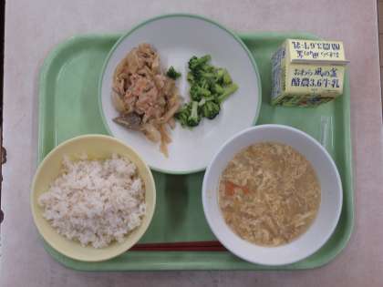 麦ごはん スタミナレバー ゆでブロッコリー 中華かきたまスープ 牛乳