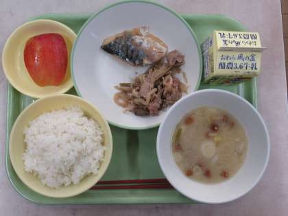 ごはん 鯖の塩焼き 茎わかめのキンピラ なめこの味噌汁 りんご 牛乳