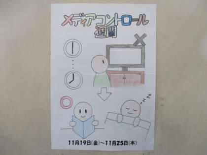 今日から25日(木)までの間「メディアコントロール週間」を実施します。テレビやパソコン、スマートフォンなど、日ごろ利用しているメディアの使い方を振り返り、メディアコントロール週間時間を有効に使うように努めましょう。