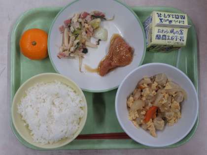 ごはん 卵とじ 照り焼きチキン チンゲンサイソテー みかん 牛乳