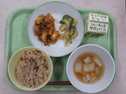 ごはん イカと豆のカレー揚げ グリーンサラダ 豆腐スープ 牛乳