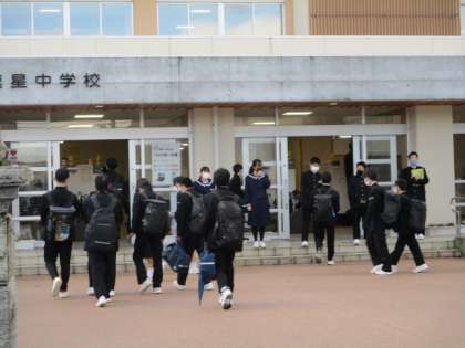 今朝は雨はやんでいましたが寒く感じました。3年生は今日と明日の2日間、冨山市学力調査を行います。今日の下校完了時間は17:30です。