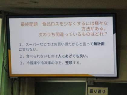 速星タイムに1年生を対象に給食委員会が給食クイズプラスを行いました。クイズの中には、食品ロスなどの現代的な課題もあります。2、3年生は来週行う予定です。