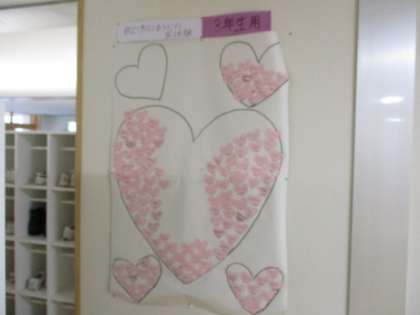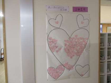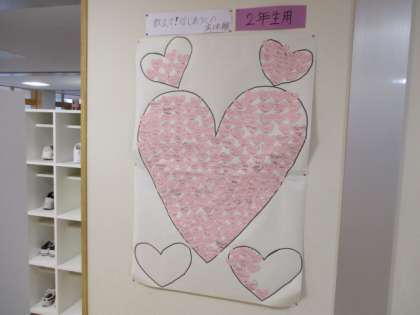 下足箱横の壁に生徒会が企画した「教えて!信じあう心実体験」の掲示があります。「信じあう心」を具体的に体験し、感じたことを一人一人がカードに書いてクラスごとに貼っていきます。まだ、未完成ですが、自分の落し物を誰かが拾って戻ってきた等、様々なエピソードがありました。