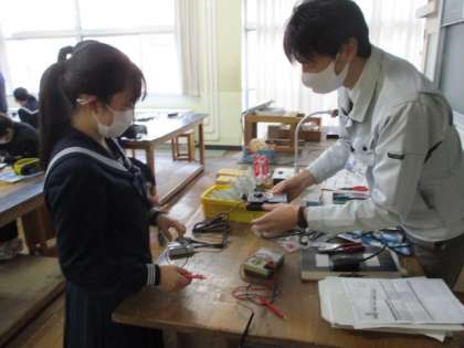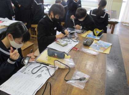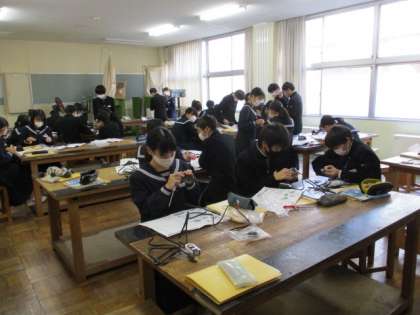 2年生の技術はテーブルタップを作製しています。完成すれば家で使用できます。写真は27Hの様子です。