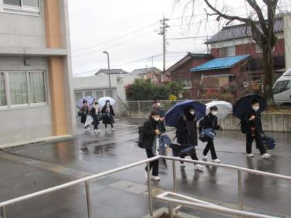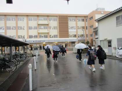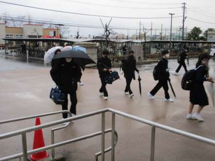今朝は登校時、雨になりました。今日は気温もあまり上がらないようです。今日の下校完了時間は16:00です。