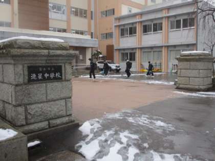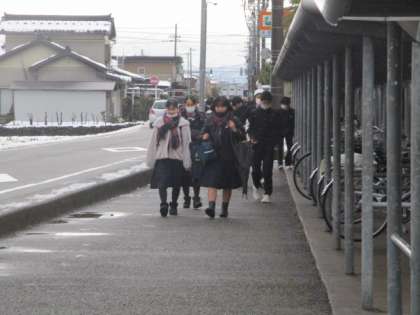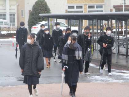 今朝は先日から降った雪が地面に残っており、自転車での通学はできませんでした。今日から保護者懇談会が始まります。今日の下校完了時間は15:00です。