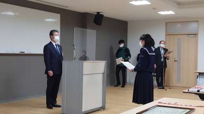 富山市教育委員会の宮口教育長に、部を代表して加藤さん(3年)が結果を報告し、教育長からお褒めの言葉をいただきました。