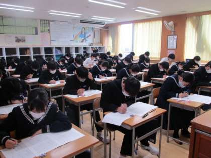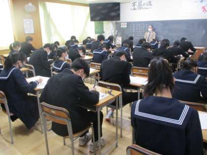 冬季休業の最終日ですが、3年生は確認テストを行いました。私立高校の推薦入試も早い学校は明日から始まります。いよいよ受検がスタートします。写真は35Hと36Hの様子です。
