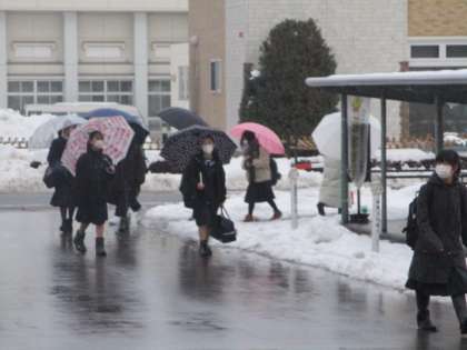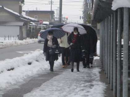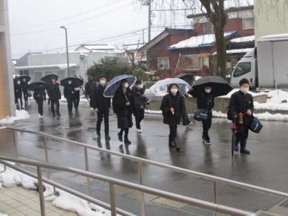 今朝は雨の中での登校になりました。玄関前の雪は大部分が溶けていました。今日の下校完了時間は15:30です。