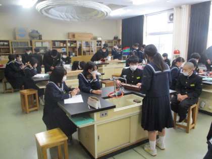 4限の13Hの理科の授業の様子です。「弦の長さ、張りの強さ、はじく強さで音がどのように変化するのか」を実験を通して学んでいます。