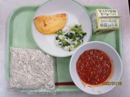 ソフト麺 ミートソース オムレツ 花野菜サラダ 牛乳