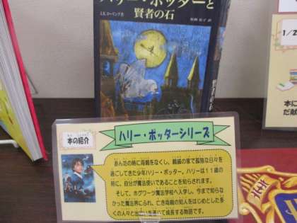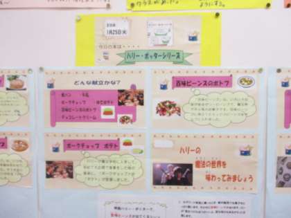 今日の給食でも紹介されましたが、今日の献立は「ハリーポッターシリーズ」に出てくる料理や食材がテーマでした。写真は展示内容です。