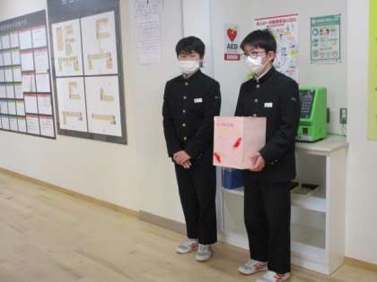 今朝も晴れた中での登校になりました。玄関ではボランティア委員会の生徒が赤い羽根共同募金と友情の絵はがきの募金活動を行っています。本日の下校完了時間は15:35です。