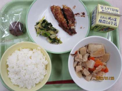 今週は全国学校給食週間ということで本に登場する料理や食材を取り入れた給食を実施します。今日は「旅館すずめや てくてくお散歩日和」から。給食にはゆず昆布和えや吹き寄せ煮、おはぎが出されました。