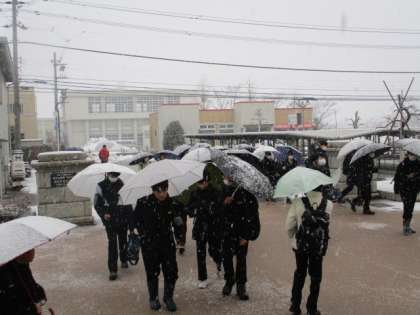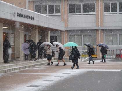 今朝は登校時になって雪が降り始めました。今日の下校完了時間は14:30です。