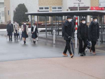 今朝は登校時に途中から雪が降り始めました。今日の下校完了時間は15:35です。