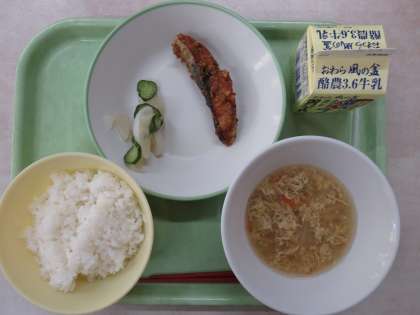 ごはん 魚の利休揚げ レモン和え 中華かき玉汁 牛乳