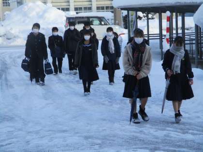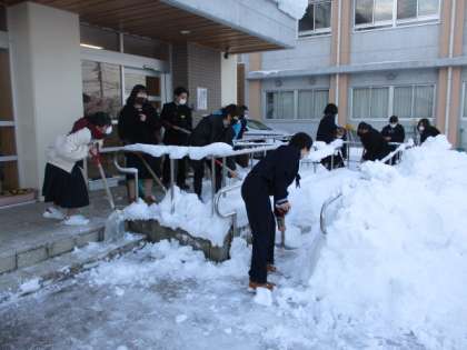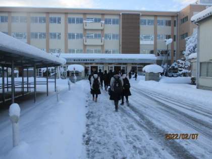 今朝の校舎前は一昨日から続いた雪が多く残っていました。除雪当番のクラスが活躍しています。今日の下校完了時間は16:30です。