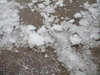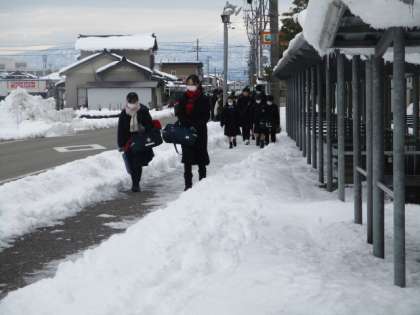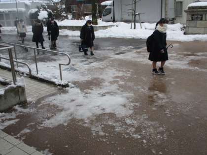 今朝までに雪の量は減りましたが、路面にはまだ残っていました。玄関前の雪は融雪剤で溶かしています。今日の下校完了時間は17:00です。