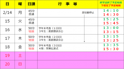 2/14(月)〜2/20(日)までの予定は、以下の通りです。