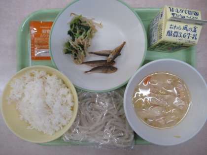 今日は「ごはん」と「うどん」炭水化物が2品出るという毎年恒例の給食でした。ごはんには穀物ふりかけをかけました。また、うどんは、白ゴマの香ばしい香りと、豆乳のまろやかな味わいで美味しかったです。また小あじの唐揚げはサクサクとした衣と噛み応えのある小あじが食欲をそそりました。