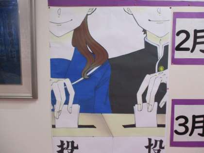A棟1階の生徒会の掲示コーナーには選挙管理委員会が作った掲示物があります。選挙に関心をもって、しっかり投票してもらいたいという思いが感じられます。