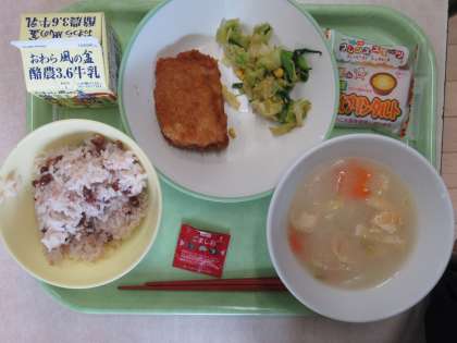 赤飯 ゴマ塩 とんかつ コーン和え 紅白白玉汁 豆乳プリンタルト 牛乳