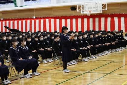 卒業生代表による答辞。コロナ禍で変更、制限の中での中学校生活でありながらも、その中でも学んだことをこれからに生かしていこうという前向きな気持ちを伝えてくれました。