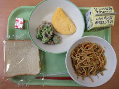 今日は通常2枚入っている食パンが1枚となり、野菜がたくさん入った焼きそばが給食に出されました。モチモチとした食感の麺と、ソースが絡んでいて、おいしかったです。