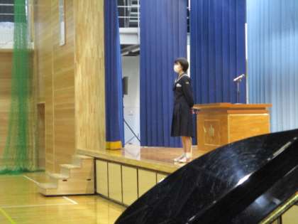 意見発表の後、修了式を行いました。式の前に校訓唱和を行いました。マスクを着用しての唱和です。