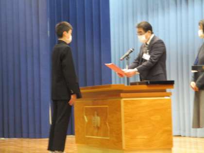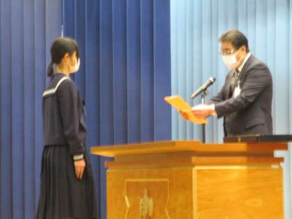 各学年の代表生徒に修了証を授与しました。次に、古野校長が式辞です。来年度に向けて新しい学年の目標をもつなど、心の準備をすることやコロナや病気に気を付けて体調を整えて新年度を迎えられるように、体の準備をすることなどを話されました。