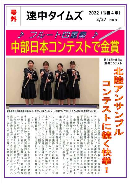 吹奏楽部(フルート四重奏)の中部日本コンクールでの活躍を「速中タイムズ『号外版』」として発行しました。