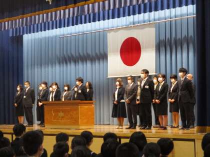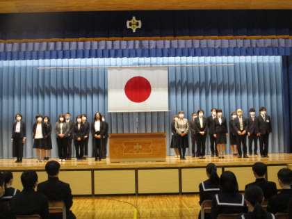 離任式を終えた後、今度は19名の新たな教職員を迎え、着任式が行われました。今後、よろしくお願いします。