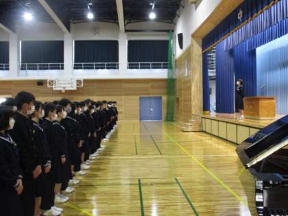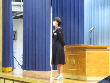 着任式後、令和4年度1学期の始業式が行われました。初めに校訓唱和を行います。