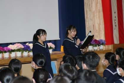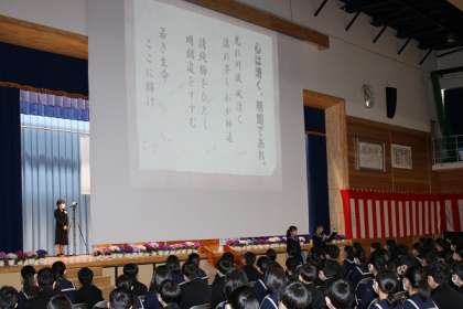 生徒会執行委員が校訓唱和と校歌をスライドを用いて紹介しました。