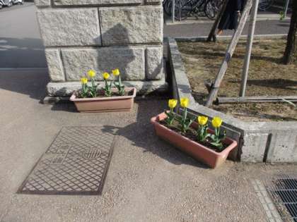 今日はとてもよい天気になりました。門近くのプランターのチューリップがきれいに咲いています。今日の下校完了時間は、17:30です。