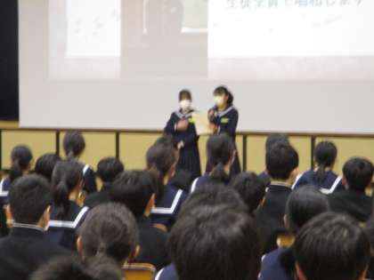 1年生は5限の学年集会で校訓唱和と城下の練習を行いました。2年生の代表生徒が説明してくれた後、全員で練習しました。