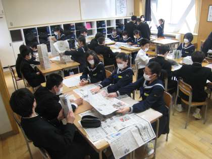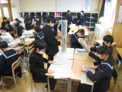 6枚の新聞紙を使って、高いタワーを作る活動です。1位の班は、178cmの高さになりました。