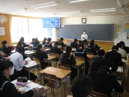 生徒たちは、真剣に先生の話に耳を傾けていました。本日、成績連絡票も配布されました。中教研学力調査の結果を見て、次に生かせるように学習に取り組んでほしいものです。