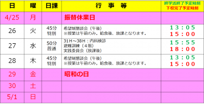 4/25(月)〜5/1(日)までの予定は、以下の通りです。