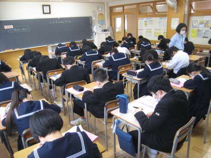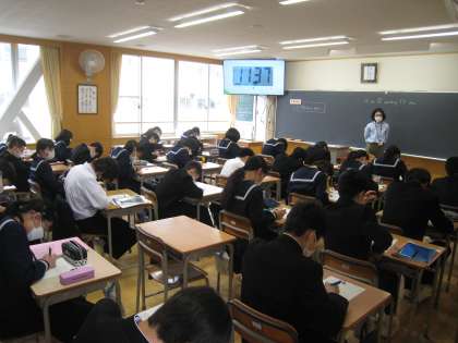 4限英語の授業の様子です。生徒たちは、これまで学習してきた内容を振り返る小テストに臨んでいます。「できたところ」と「できなかったところ」を把握して、次回同じような問題が出題されたときに解けるようになるとよいですね。