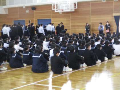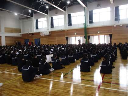 今回はグラウンドの状況が悪かったため体育館に避難しました。避難完了後、校長先生の講評を聞きました。その中で、火災では正確な情報(放送)を得ることや煙(一酸化炭素)を吸わないようにすることが大切であることなどを学びました。