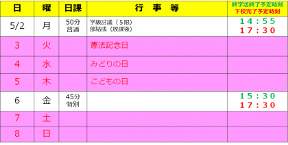 5/2(月)〜5/8(日)までの予定は、以下の通りです。