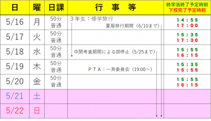 5/16(月)〜5/24(日)までの予定は、以下の通りです。